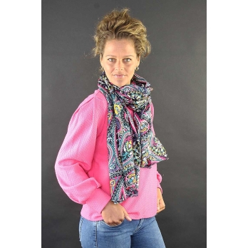 Een stijlvolle herfstsjaal met grafische print en rosé-gouden glinstering. Verkrijgbaar in zwart, blauw, fuchsia en groen. Gemaakt van 70% viscose en 30% wol voor warmte en comfort.