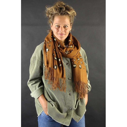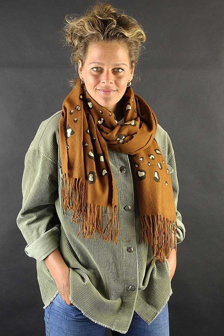 Een herfstsjaal van 90% viscose en 10% wol, in een subtiele effen kleur met verfijnde panterprint accenten. De panterprint is verfraaid met een elegante gouden afwerking, waardoor deze sjaal een stijlvolle en warme aanvulling is op je herfstgarderobe.